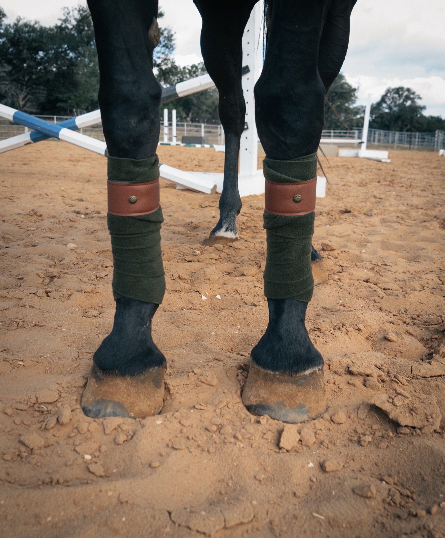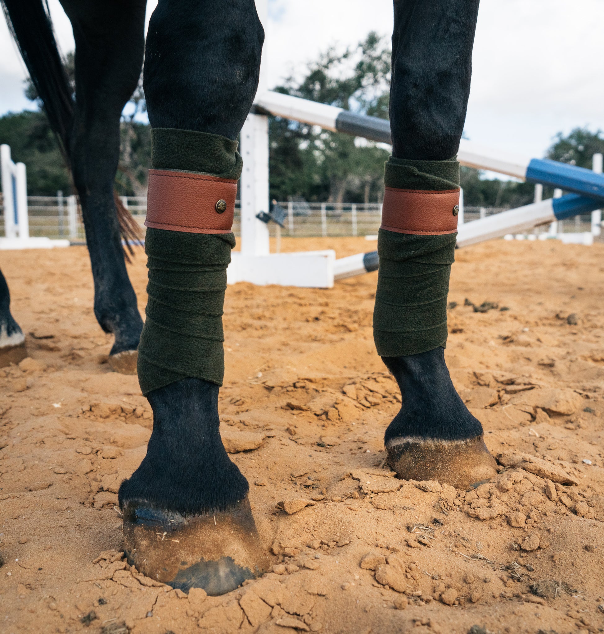Dark olive green with cognac leatherette trim. Match or coordinate with the range of 16C saddle pads. Set of 4, soft medium weight polar fleece polos. Finished with 2" hook & loop and durable leatherette trim. 4.5" wide X 9 ft.