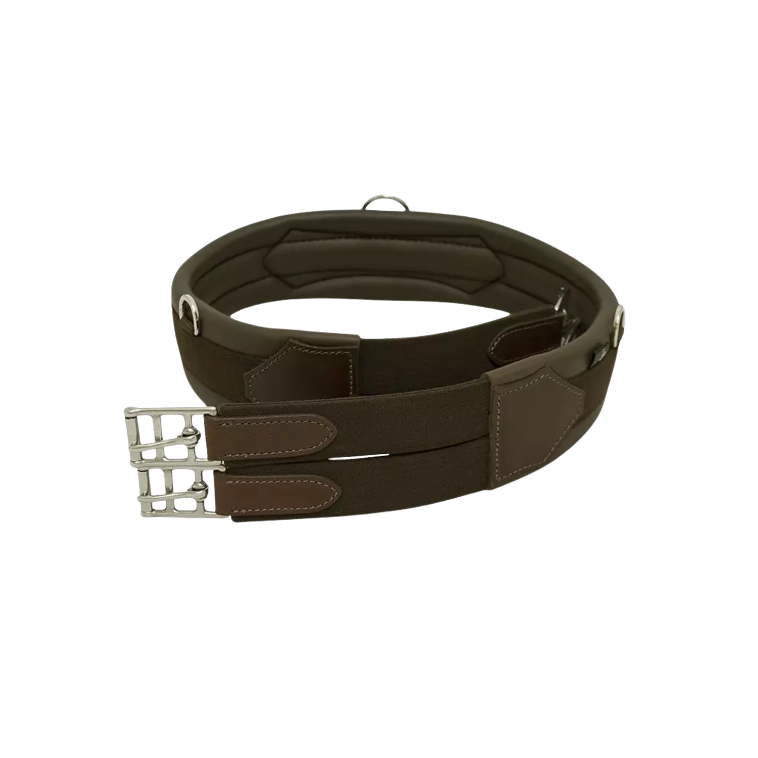 - Leather reinforcements, roller buckles, and double-ended, triple-layered elastic.